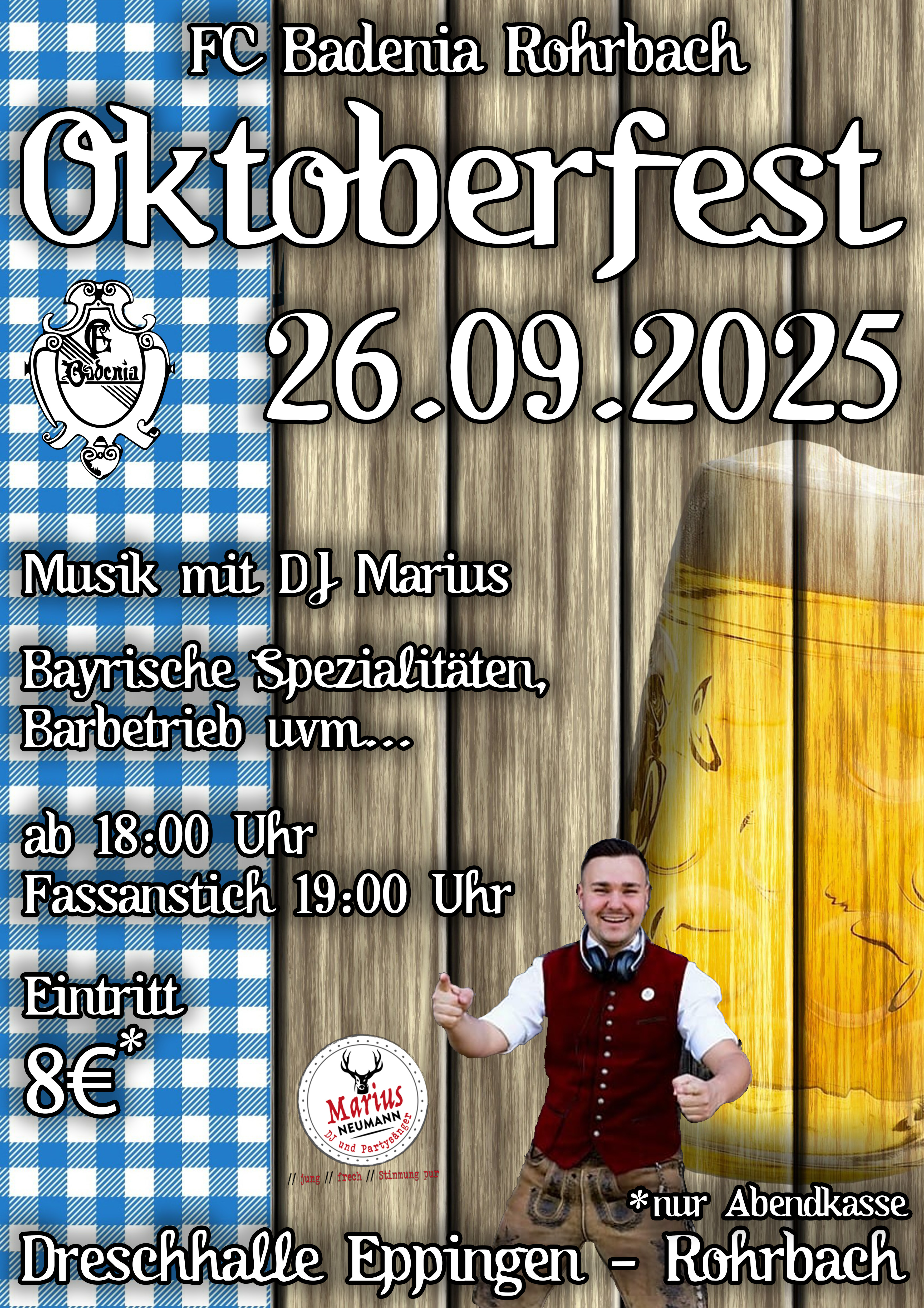 Auch in diesem Jahr feiert der FC Badenia wieder Oktoberfest in der Rohrbacher Dreschhalle. Am Freitag, den 26. September 2025 öffnen ab 18 Uhr die Tore. Um 19 Uhr ist der traditionelle Fassanstich geplant. DJ Marius Neumann sorgt wieder für ausgelassene Partystimmung und für das leibliche Wohl ist natürlich auch bestens gesorgt. Wir freuen uns über eine volle Halle.