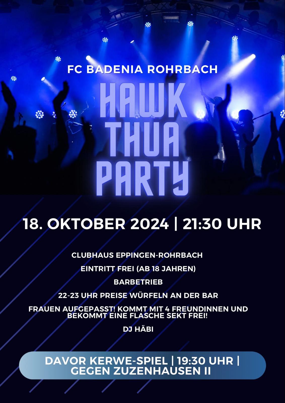 Der FC Badenia Rohrbach lädt im Anschluss zum Freitagabendspiel am 18.10.2024 zur Kerwe-Party im Clubhaus ein. Die Party bietet Barbetrieb, es können Preise gewürfelt werden und mit einem bunten Musik-Mix soll das Kerwewochenende eingeläutet werden. Der Eintritt ist natürlich frei. Wir freuen uns über euer Kommen.