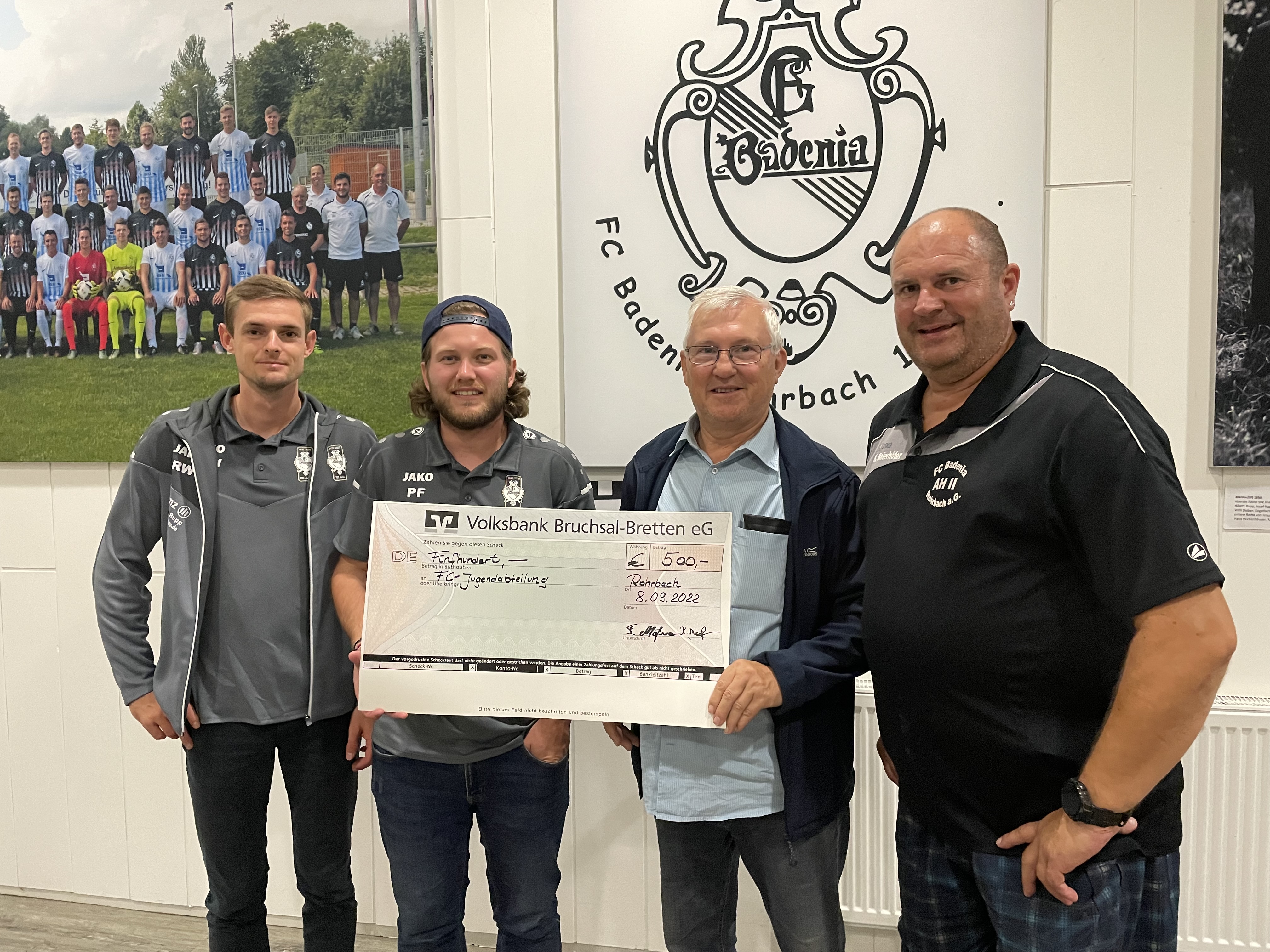 Die Jugendabteilung des FC Badenia Rohrbach bedankt sich bei den Alten Herren für die großzügige Spende von EUR 500,00 direkt für die Fußballjugend. Die Spende hilft uns in allen Bereichen, angefangen von den Kosten am Spieltag, Trainingsmaterialien, Trikots oder auch um den einen oder anderen Mannschaftsabend zu veranstalten. Der Gutschein wurde den Jugendleitern Philipp Frank und Rico Weinert von den AH - Vorständen Fritz Mössner und Klaus Maierhöfer im Clubhaus des FC übergeben. Nochmal ein großes Dankeschön an alle Mitglieder der AH!