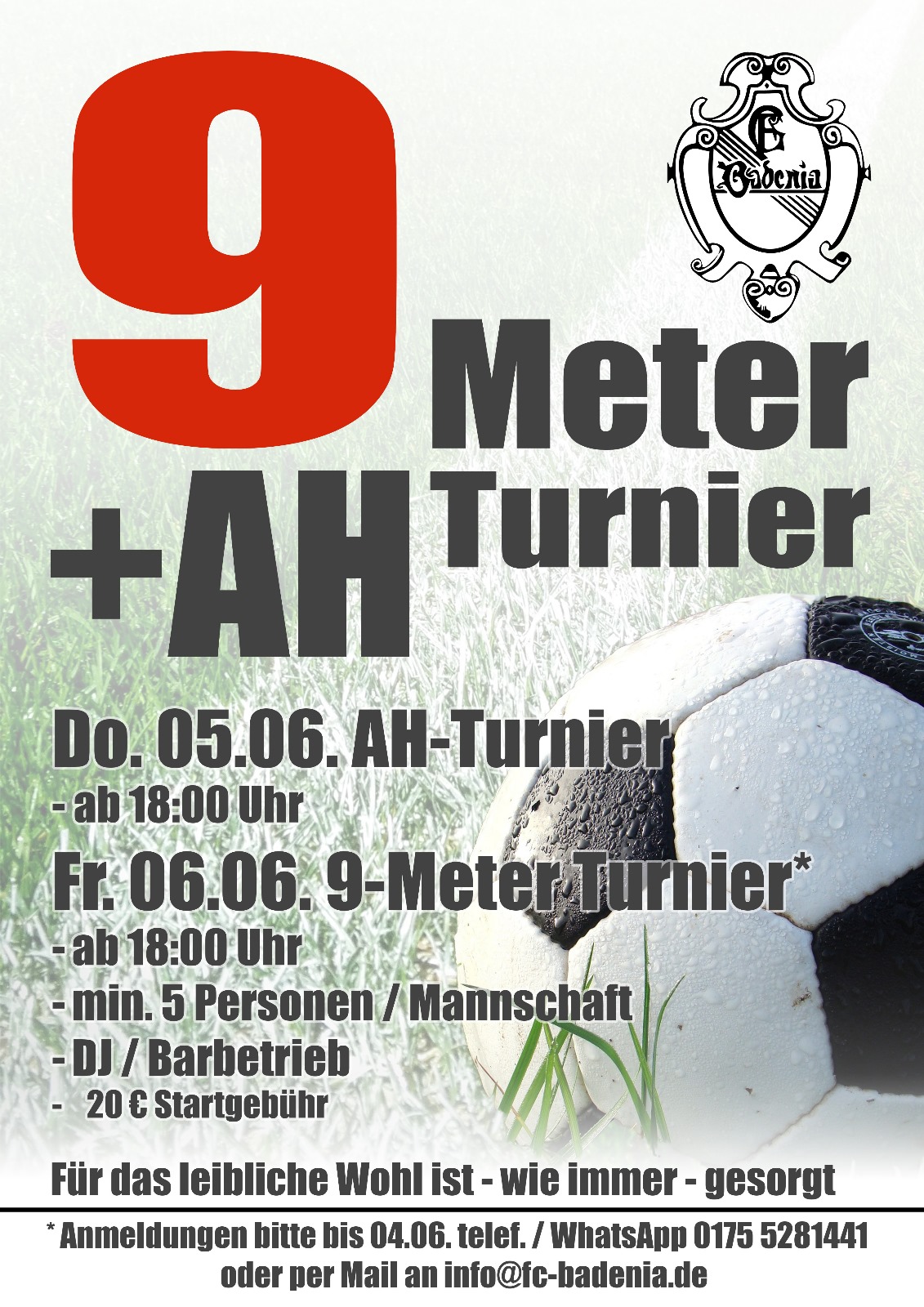 Am Donnerstag, 05. Juni findet das diesjährige AH-Turnier statt. Ab 18 Uhr spielen die AH-Mannschaften den Turniersieger aus. Einen Tag später findet das mittlerweile traditionelle Neunmeter-Turnier statt. Los geht es ebenfalls ab 18 Uhr. Das Teilnehmerfeld kann bis zu 24 Mannschaften betragen. Wir freuen uns über viele Anmeldungen und sind gespannt welche treffsichere Mannschaft sich den Wanderpokal sichert. Anmeldungen sind möglich per Mail an